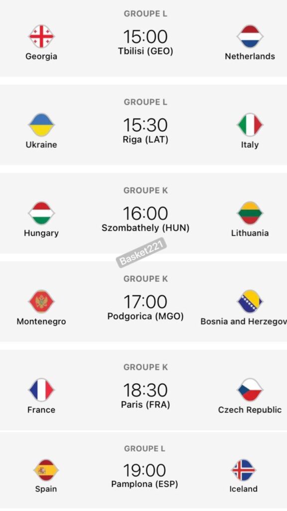 Six rencontres sont programmées pour ce jour. Il s’agit de Géorgie – Pays Bas, Ukraine-Italie, Hongrie-Lituanie, Monténégro-Bosnie Herzégovine, France-République Tchèque et Espagne-Islande. La Grèce, l’Allemagne, France et l’Italie sont actuellement leaders des quatre groupes (I, J, K et L) de ce deuxième tour.